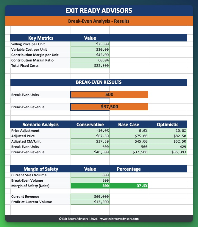 Calculate your break-even point in units and revenue, with scenario modeling to understand how pricing changes affect your profitability threshold.